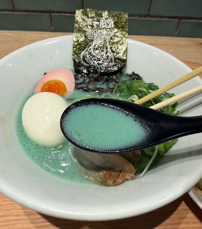 ブルーグリーン、いわゆる初音ミクカラーのとんこつラーメン! なんとも気になったので食べてみた。