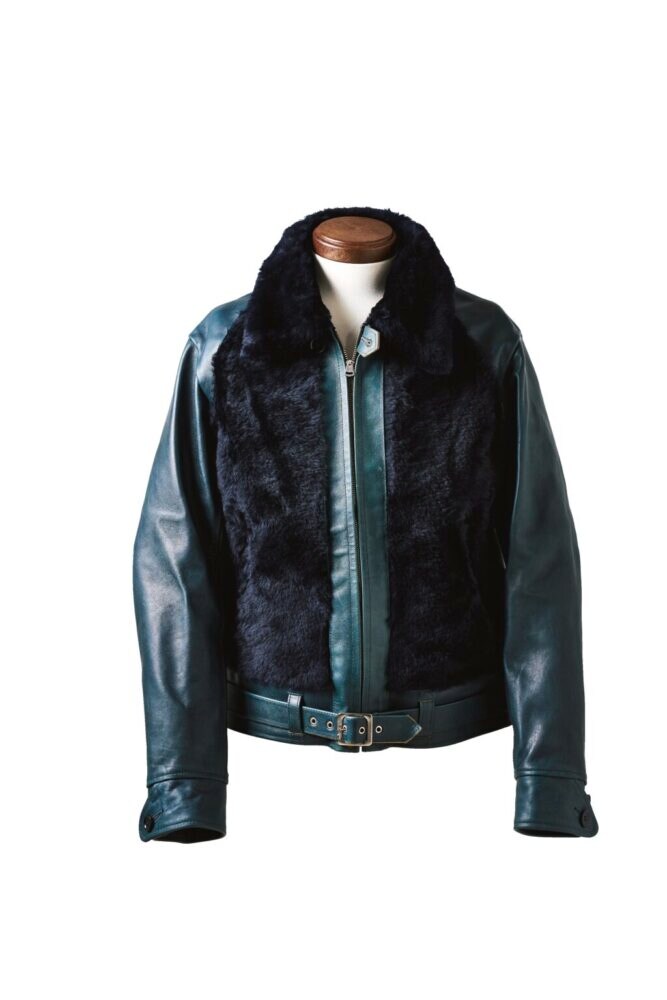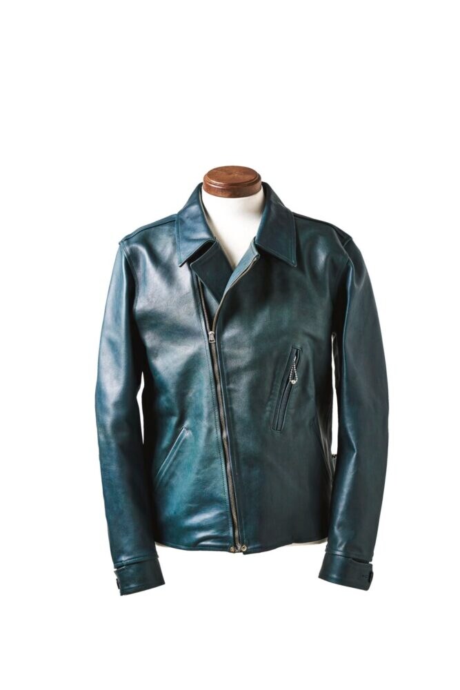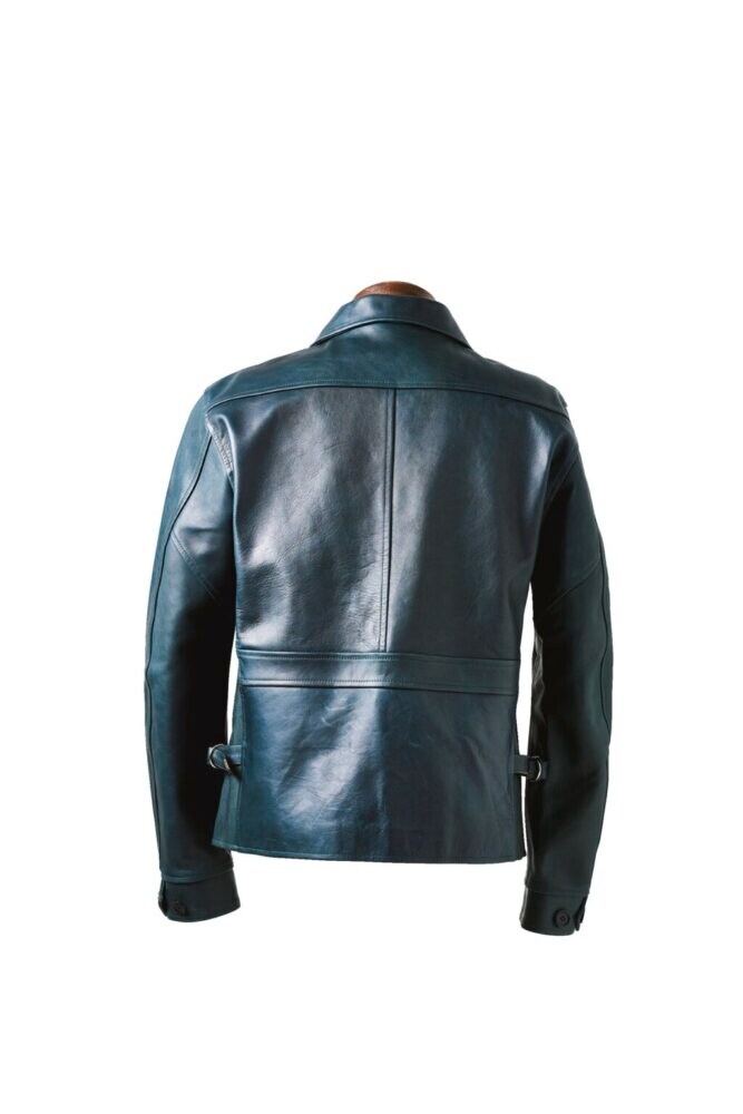 ロングセラーモデルのダブルブレスト・スポーツジャケットをインディゴ・ホースハイドで再構築。’30sをイメージソースとした3ポケット、ボールチェーン、カフスなどクラシカルなディテールワークが随所に光り、モーターサイクルジャケット黎明期を彷彿させる。シンプルゆえに、着込むほどに象徴的なレザーの表情が際立つ育てがいのあるスタイルで、インディゴ・ホースハイドの気品とワイルドな貫禄を宿す1着だ。60万5000円