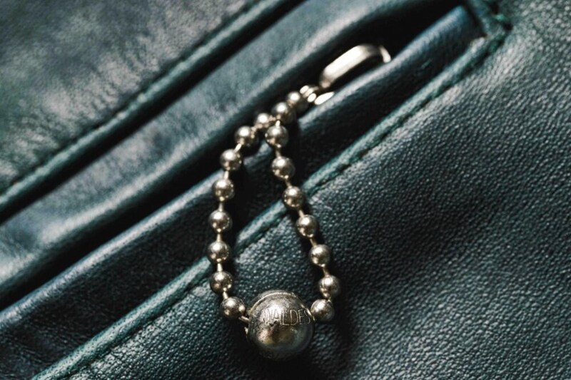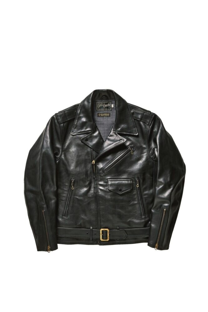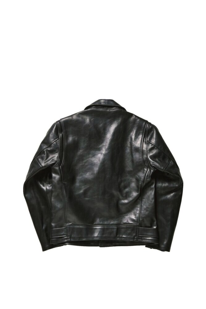 スタンダードラインではラッカーフィニッシュのホースハイドを採用するDPライダースを、オイルリッチ・ホースハイドに変更し顔つきを一新。変形Dポケットが印象的なモーターサイクルジャケットは、4つのアウターポケット/インナーポケット/チンストラップを備え、リアルクローズとしての実用性を宿す。オイルを多く含んだレザー特有のシックな艶感に加え、ドットボタンをブラックで統一し、洗練された大人の品格を漂わせる。38万5000円