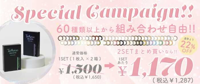 TeAmo 1MONTHは1箱1枚入り×2での販売だから、両目の度数が違う方にもぴったり。さらに、2セットまとめ買いなら2,340円(税込2,574円)とお得に購入可能です♪