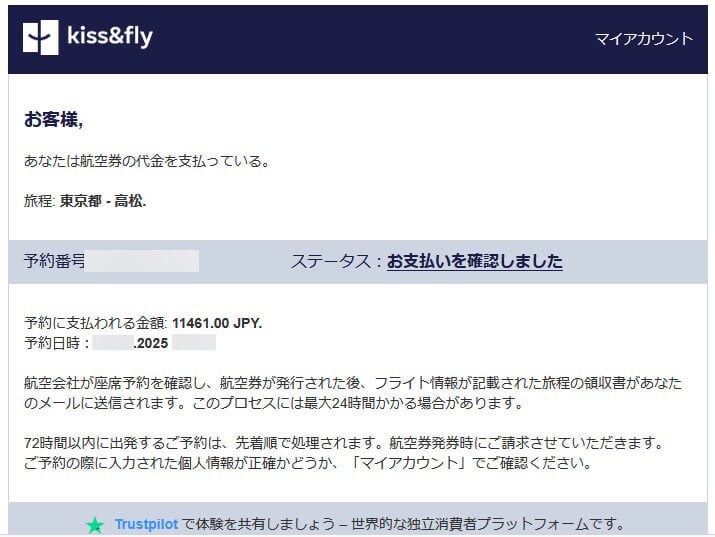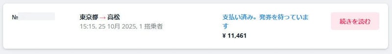Kiss&flyのマイページでは、支払いや発券のステータスをリアルタイムで確認することができた。以下の画像は、支払いが完了した直後のステータス画面。「支払い済み」「発券を待っています」となっている。買えた、本当に買えた! JALのチケットを半額以下で!