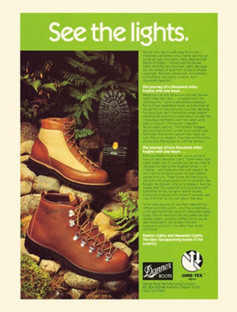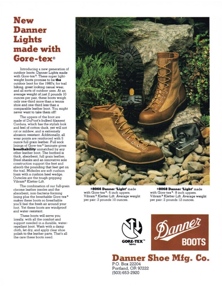 [ダナーライト]の誕生当時の広告。冒頭には「Introducing a new generation of outdoor boots(新世代のアウトドアブーツのご紹介)」と記されており、当時の革新的な発明であったことがうかがえる。