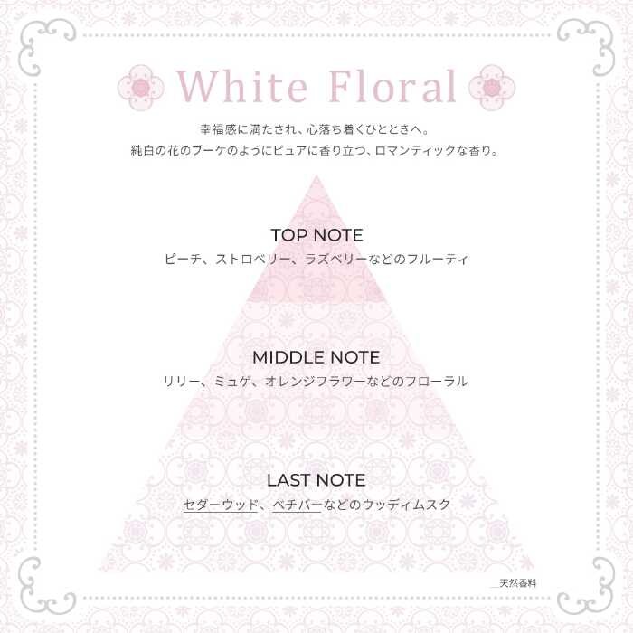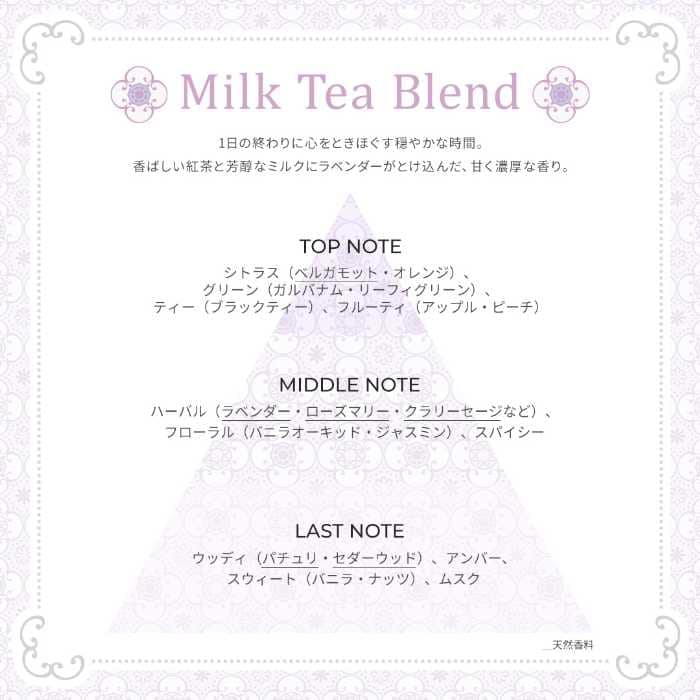 清らかなブーケを思わせる〈ホワイトフローラル〉は、ピュアで可憐な印象に。芳醇な紅茶とミルクのまろやかさにラベンダーを合わせた〈ミルクティーブレンド〉は、深い安らぎを感じさせます。