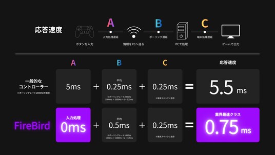 一般的なコントローラーの応答速度は5ms~10ms程度。速いとされるものでも1~2ms程度かかります。対してFireBirdはわずか0.75msという圧倒的な高速応答を実現。わずかな遅延が勝敗を分ける競技シーンで、確実なアドバンテージをもたらします。。