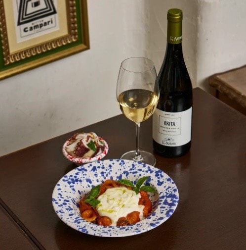 濃厚トマトソースに、プーリア産ブッラータチーズをのせて。