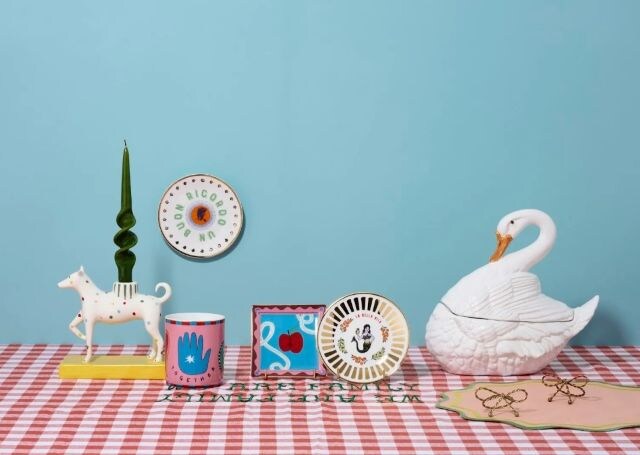 (上から)「ビトッシ ホーム」の「キャンドルホルダー Baloo」(69,300円)[現品限り]、「フレグランスキャンドル」(13,200円)[現品限り]、「ゴールドリムスクエアトレイ Apple」(10,450円)、「ゴールドリムブレッドプレート」(各6,600円)、「スワンオブジェ」(64,900円)[現品限り]、「リボンナプキンフォルダー set of 4」(9,350円)、「スカラップエッジラウンドプレイスマット」(5,830円)、「ギンガムチェック we are family テーブルクロス」(39,600円)[現品限り]
