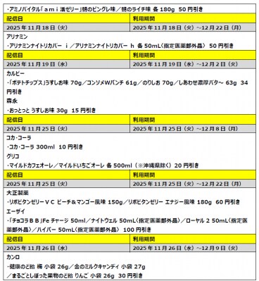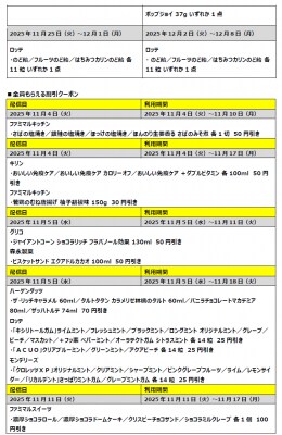 2025年11月4日 11月のファミペイは勤労感謝月間! 出社のお供にうれしい軽食、飲料などのクーポンを11月4日(火)から配信 ~クーポン生活でどのくらいおトク?モデルケースもご紹介~ ヘイグ 以下、メーカー様より頂いたリリース文を掲載しております。 株式会社ファミリーマート(本社:東京都港区、代表取締役社長:細見研介)は、勤労感謝の日がある11月にファミマのアプリ「ファミペイ」の利用者さまへ、ランチやおやつに最適な総菜やお菓子などのクーポンを2025年11月4日(火)から順次配信いたします。■11月23日(日)は勤労感謝の日。ファミマが日々頑張る皆さまを応援! 11月23日(日)は勤労感謝の日です。ファミリーマートは、日々多くの社会人をはじめとする皆さまにご利用いただいております。そんな皆さまを応援すべく、11月のファミペイは、ランチに最適な総菜やお弁当、ブレイクタイムに欠かせないお菓子や飲料などのクーポンを順次配信いたします。配信元企業:株式会社ファミリーマート