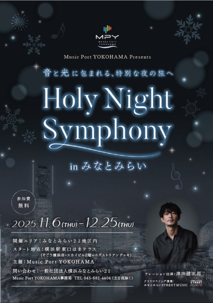 イルミネーション開催期間中、様々なイベントを開催。本点灯を開始する11月6日(木)から12月25日(木)まで、視覚と聴覚で楽しむ、新感覚のイルミネーション体験「Holy Night Symphony in みなとみらい」が開催される。音声ARアプリ「Locatone(ロケトーン)」を使用し、「ヨコハマミライト」エリア中の特定の各スポットを訪れると位置情報に連動して、音声が聞こえてくる。⻘を基調とした幻想的なイルミネーション空間を舞台に、地区内で活躍するミュージシャンによるクリスマスソングの演奏と共に、声優・俳優として活躍する津田健次郎氏の、素敵な声をオリジナルのストーリーに乗せて届ける。