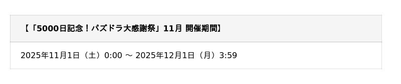 「5000日記念!パズドラ大感謝祭」を2か月にわたって実施いたします。「5000日記念!パズドラ大感謝祭」11月の目玉は、豪華報酬がもらえる特別なログインスタンプです。1日1回のログインで豪華報酬を手に入れることができ、「魔法石」を合計100個、「13周年記念たまドラ」を合計5個、獲得できるチャンス。新登場の「守霊の天体シリーズ」モンスターを追加した「大感謝祭!アンケートスーパーゴッドフェス」なども実施予定です。