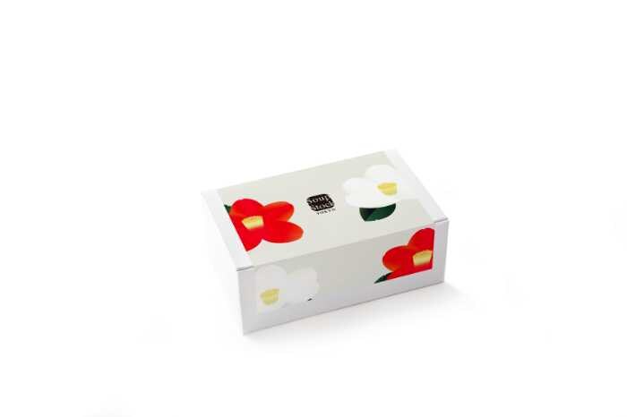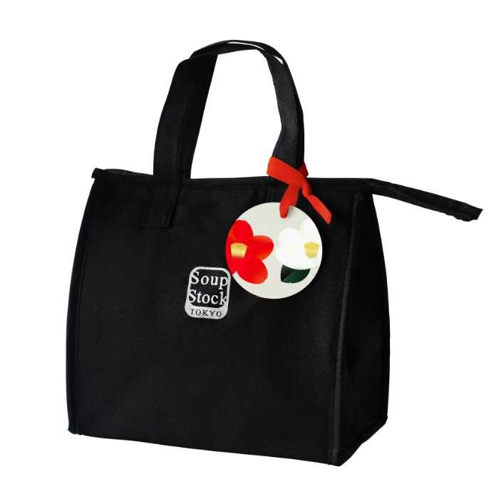 赤いリボンやつばきのモチーフが冬の贈りものにぴったり。クーラーバッグやタグは店頭限定での展開です。