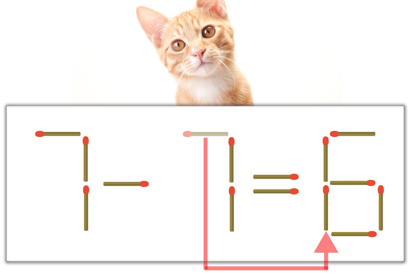 「7」のマッチ棒を1本、右にスライドさせて「6」を作り、「7-1=6」にする。※解答は複数ある場合があります。