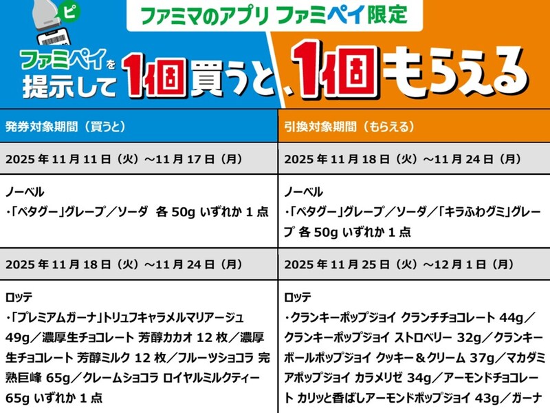 クーポンは「ファミペイ払いで1個買うと1個もらえる」タイプと「全員もらえる割引」タイプを配信する。対象商品にはクリスピーチキン、コカ・コーラや綾鷹などの飲料、ノーベルやロッテの菓子類、さばの塩焼きなどの総菜、カップヌードルやスイーツ類が含まれる。ファミリーマートによると、11月11日から17日の1週間でクーポンを活用すると、合計600円相当お得になるという。