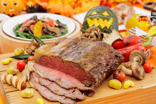ほかにも、「ブラックカレー」や「ハロウィーン風ブラックパスタ」、「牛肉と茸の煮込み」、「ローストポークのメープル醤油焼き」、「サーモンの茸ソースソテー」に加え、「葡萄と林檎のブルーチーズ和え 蜂蜜添え」など味覚にも彩りにもこだわったメニューが揃います。