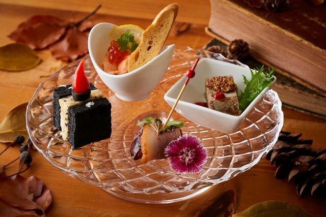 セイヴォリーメニューイメージ「栗と柿のミートパテ」「トリュフ玉子の竹炭パンサンドウィッチ」「鴨とサツマイモのブロシェット」「秋鮭のリエット キノコとレモン風味」