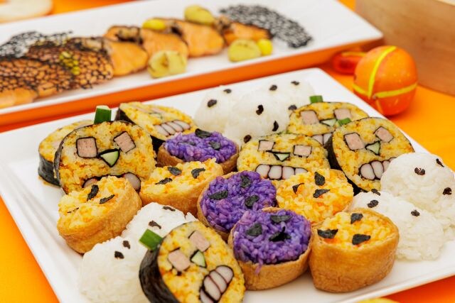 「ジャックオランタンの飾り寿司/お化け稲荷/ガイコツのおにぎり」