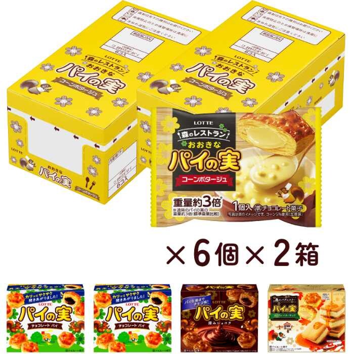 内容は、「おおきなパイの実<コーンポタージュ>」×2箱、「パイの実」×2箱、「チョコを味わうパイの実<深みショコラ>」×1箱、「パイの実<メープルバターサンド>」×1箱の計6箱入り。
