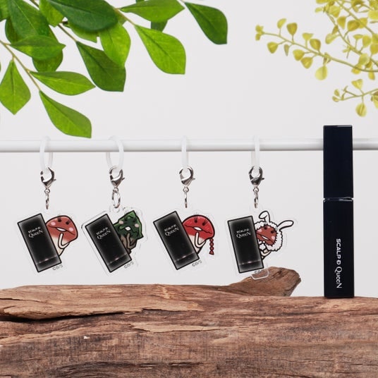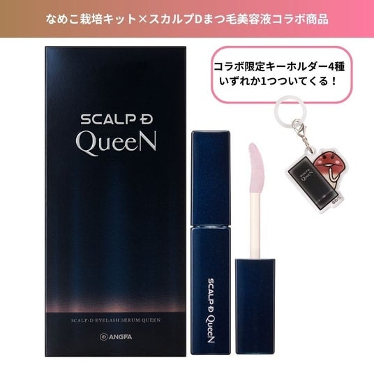 キーホルダーには、なめこ・枯れなめこ・なめ子・白ウサギなめこがそれぞれ「スカルプDまつ毛美容液 クイーン」の陰からのぞくデザインで登場します。