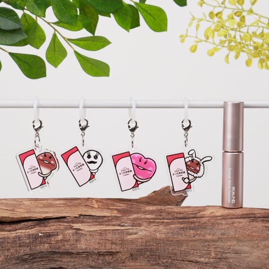 コラボ限定デザインのキーホルダー(全4種のうち1つ)をノベルティとしてプレゼント。キーホルダーには、まつ育ver.のなめこ・マサル・ラブなめこ・白ウサギなめこがそれぞれ「スカルプDまつ毛美容液 プレミアム」の陰からのぞく姿で登場します。