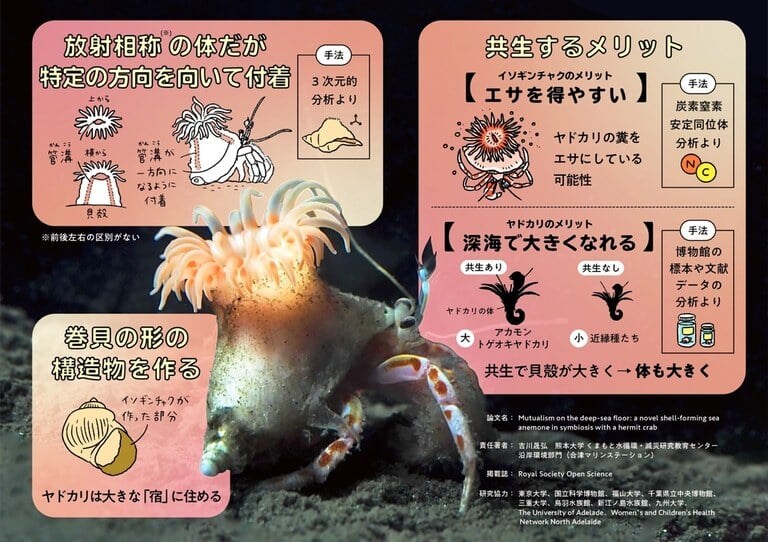 炭素窒素同位体の分析によれば、イソギンチャクはヤドカリの糞などを食べて栄養を得ている可能性があり、逆にヤドカリもこのイソギンチャクと共生することで、他のヤドカリより大きな体を維持できていると考えられます。