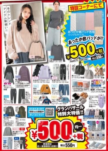 「婦人デザインニット各種」「婦人差込みマフラー各種」「婦人厚底サボサンダル」「婦人カップ付インナー各種」などが550円、「婦人デニムワイドストレートパンツ」は770円、「ボアフードブルゾン」や「婦人キルトジャケット」「紳士・婦人ふわもこパジャマ」などが1100円、「あったか敷きパッド(シングルサイズ)」が990円など、今季必見のアイテムが驚きの安さで登場です。