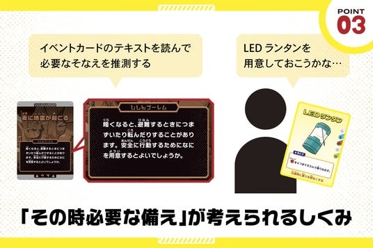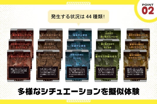 開発段階から防災士や学校関係者が参画し、“教える防災”から“楽しく体験する防災”へというコンセプトの下で開発。災害時の防災行動や協力性など災害疑似体験の要素を重視し、且つカードゲームとしても楽しく繰り返しプレイしたくなるようなルール設計により、“考えて行動する力”を楽しく育むツールとして完成しました。