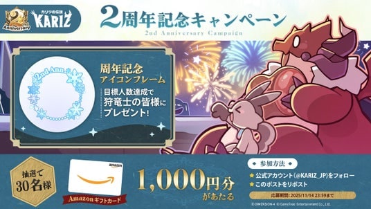 ZlongameとGameTreeは、竜と暮らす冒険RPG『KARIZ -カリツの伝説-』(以下:カリツの伝説、カリツ)が2025年11月8日(土)にアプリ配信開始から二周年を迎えることを記念し、狩竜士の皆様へ感謝の気持ちを込め、11月5日(水)よりゲーム内・外でのアニバーサリーイベントに加え、『ピングー』とのコラボイベントを開催することをお知らせします。