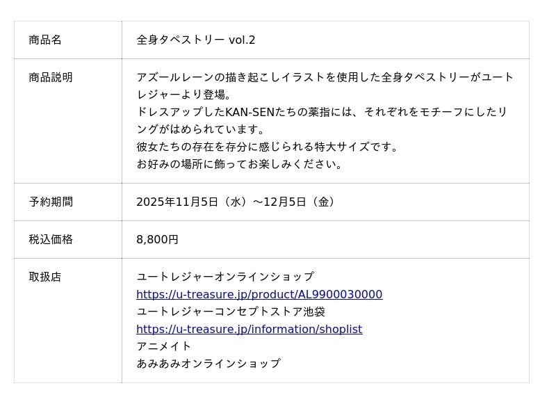 株式会社ユートレジャー(本社:東京都新宿区、代表取締役社長:青木 興一、株式会社ケイ・ウノの連結子会社)は、スマートフォン向けゲームアプリ「アズールレーン」とのコラボレーションアイテム「描き下ろし全身タペストリーvol.2」の予約受け付けを2025年11月5日(水)~12月5日(金)の期間、ユートレジャーオンラインショップ、ユートレジャーコンセプトストア池袋にて行います。