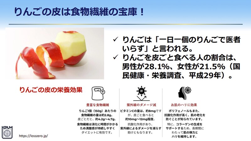 りんごの皮は食物繊維の宝庫と言われていて、皮ごと食べることでより健康的な食事になる。皮つきなら、りんご「ふじ」の場合は食物繊維総量が6.1g、うち発酵性食物繊維が1.6gとなっていて、たとえば朝食でりんごを1個皮つきで食べることで、不足している1日の食物繊維を十分補うことができる。