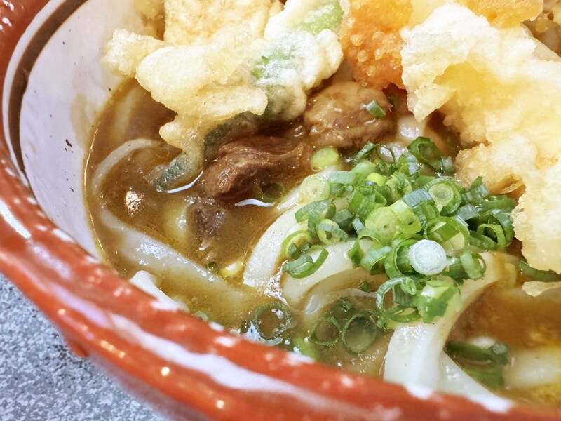 今回オーダーしたうどんは、名物のカレーうどん。天ぷらがたくさん盛られているバージョンにしました。
