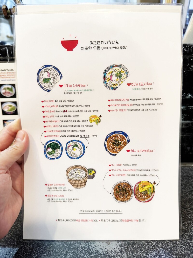 メニューにはたくさんのうどんメニューがあって迷います。英語やハングルのメニューもあるので、やはり外国人観光客も多いのでしょうね。