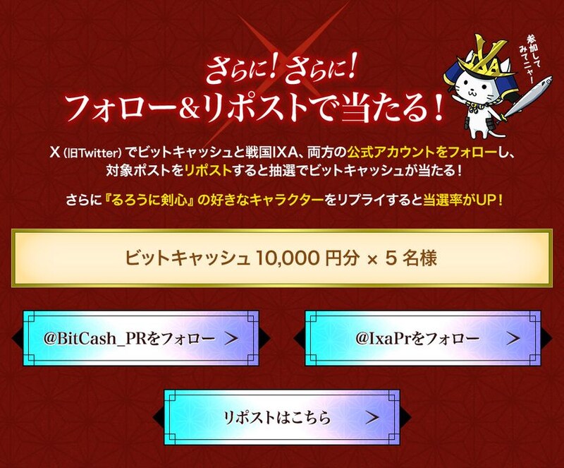 ※「リポストして当たる!」は「戦国IXA×ビットキャッシュ るろうに剣心コラボ記念キャンペーン」及び「DMM GAMES版限定!戦国IXA×ビットキャッシュ るろうに剣心コラボ記念キャンペーン」の当選本数と共有です。
