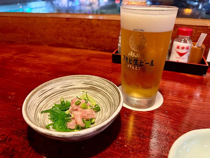 するともうね。これなんですよ。「庄や」はお通しからして最高。今回はマグロのタタキのお出ましでしたが、まさにこれが挨拶代わり。「今日の魚はこのくらい鮮度がいいすよ〜」とさりげなくアピールしてくるのです。これだけで結構飲めてしまう……!