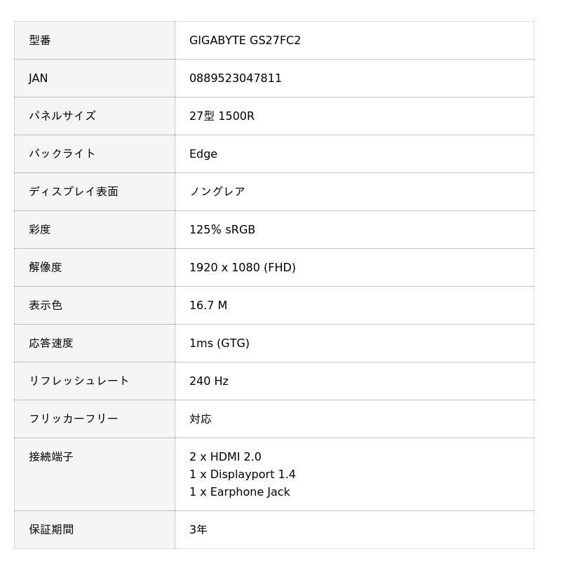 GIGABYTE GS27FC2 | GIGABYTE(ギガバイト) 27インチ FHD(1920x1080) 曲面 液晶ゲーミングディスプレイ/モニター