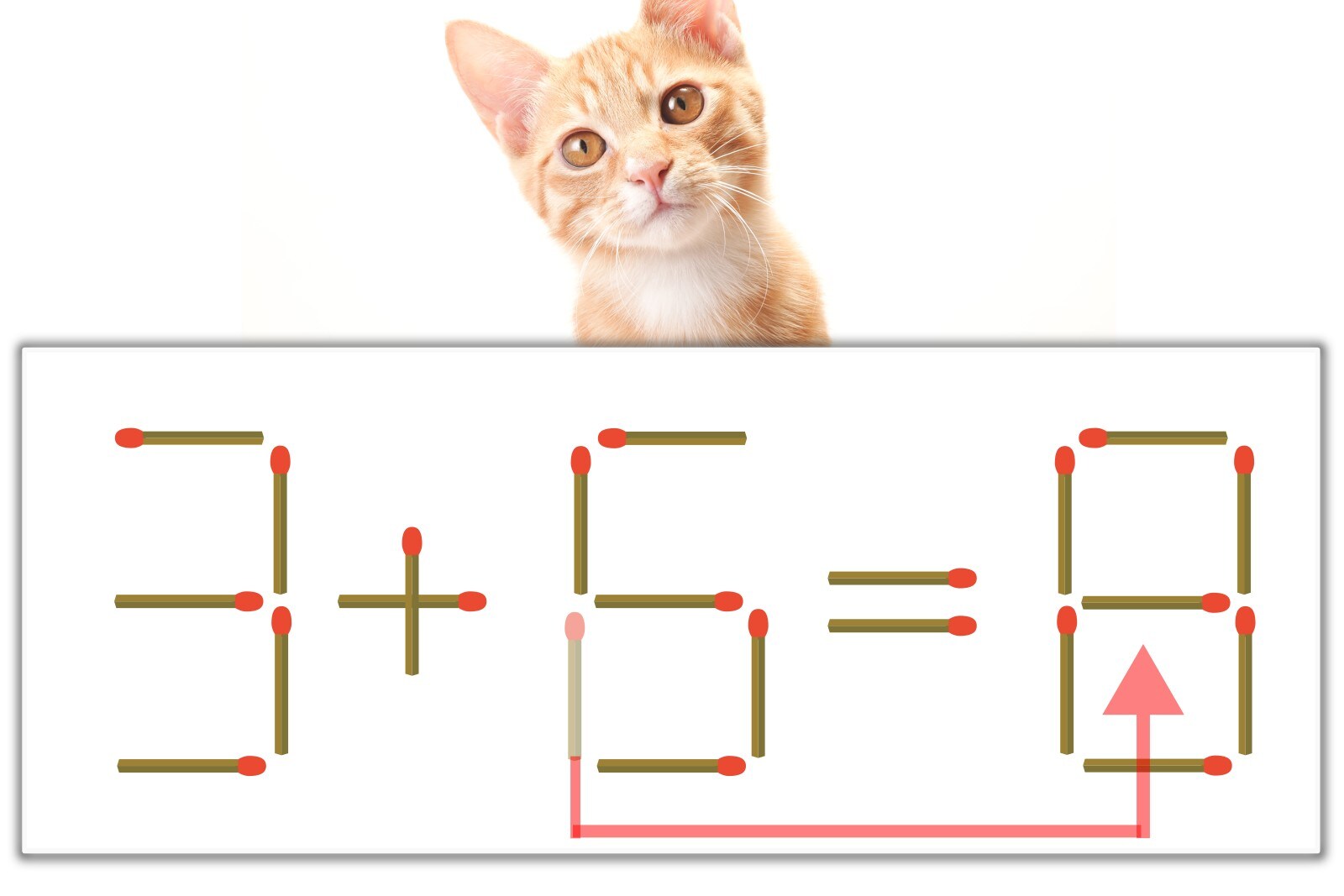「6」のマッチ棒を1本、右の答えにスライドさせて「8」を作り、「3+5=8」にする。※解答は複数ある場合があります。