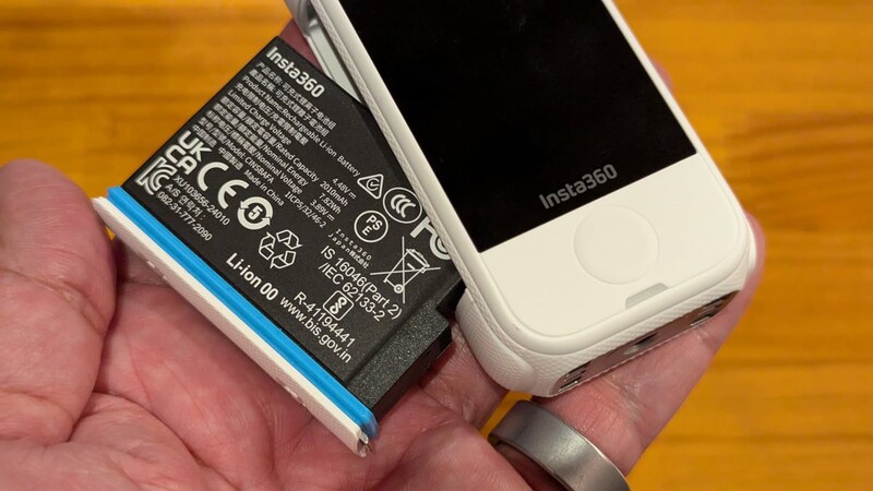 取り外し可能なバッテリーは容量2010mAh。省サイズのため仕方ないとは思いますが、X4ともX5とも互換性はありません。8K30fpsの360°動画撮影で88分の撮影が可能。内蔵ストレージは非搭載で、別売りのmicroSDカードに記録します。
