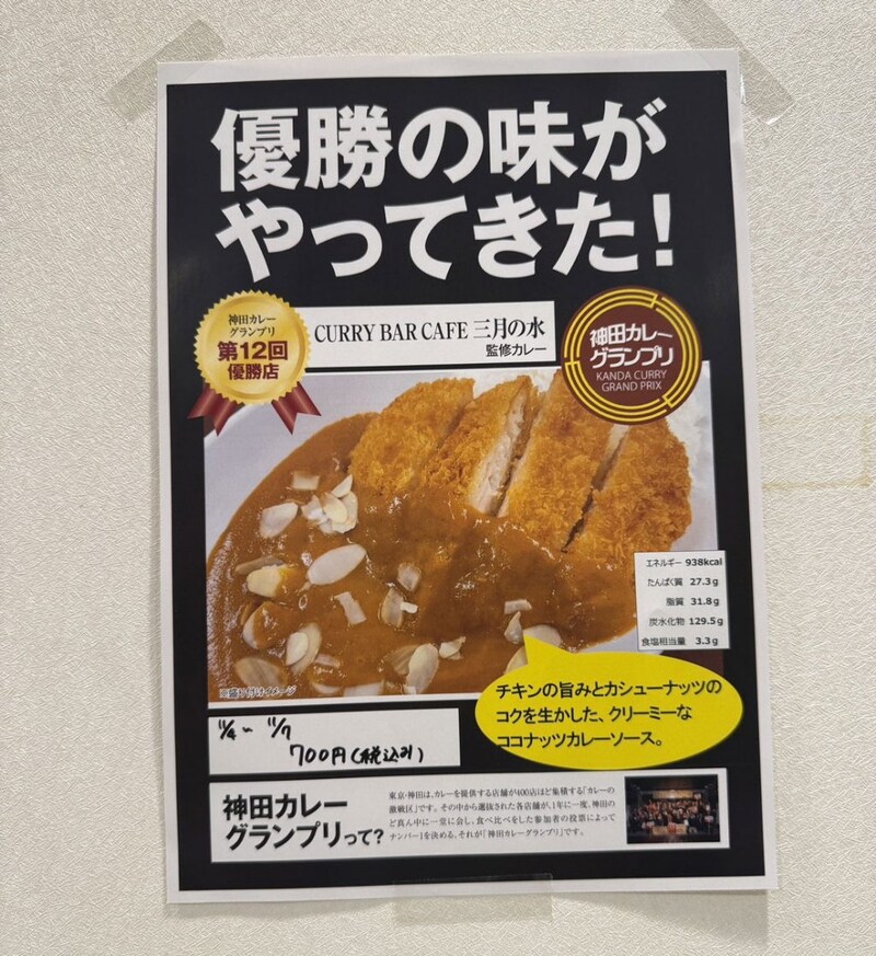 11月4日から提供されている「三月の水」監修のチキンカツカレー、なんと700円!
