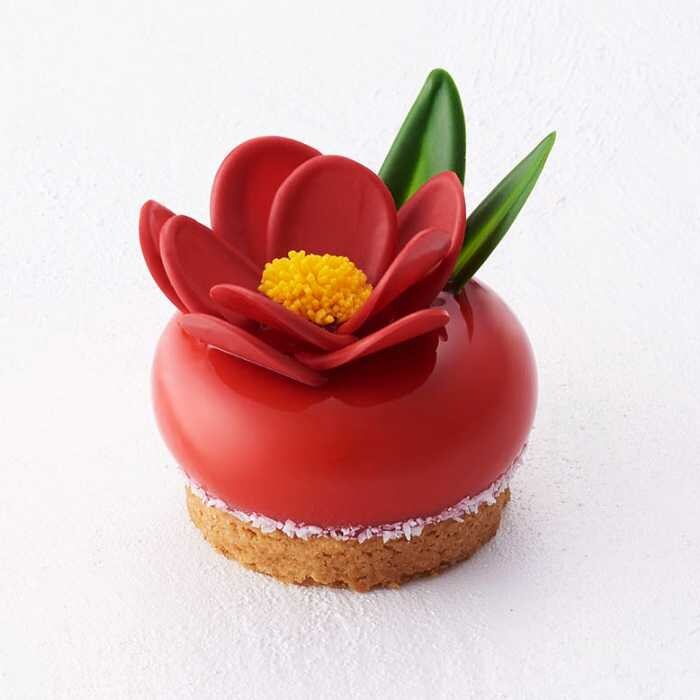 真っ赤な花を咲かせる寒椿をモチーフにした「寒椿(ショコラブラン・フランボワーズ)」930円に、雪の輝きを閉じ込めた「雪の結晶(苺とフロマージュ)」880円。