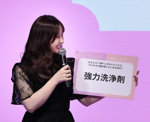 タレントの柏木由紀(34歳)が11月4日、「muice」×「upink」×「matsukiyo」のコラボ新商品発表会に登壇。「もしも10秒しかないとしたら、マツキヨで絶対に買うものは何?」との質問に答えた。