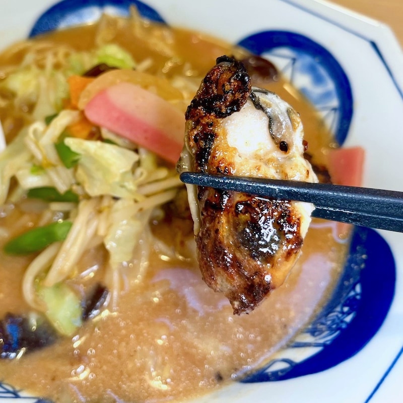 カリカリに焼き上げられたかきが乗ったちゃんぽんは、見た目にも食欲をそそってくる。スープは4種のみそで仕上げられており、濃厚なコクと甘みがありつつ、ほのかな辛みとかきの風味が感じられる奥深い味わいだ。表面に油膜が張っていることでしっかりとパンチがあり、スープを熱々のまま最後までいただけるという、この季節にはありがたい仕様だ。