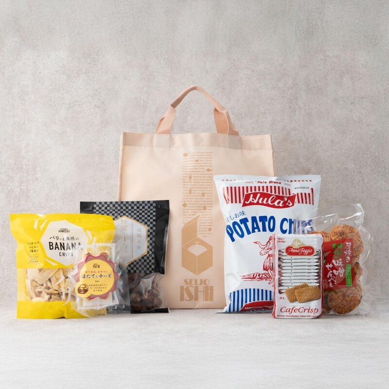 成城石井 ショッピングバッグ(ライトシナモン)/アンナファッジョ カラメルビスケット/成城石井 パリっと食感のBANANA CHIPS/成城石井 ほたて&チーズ/成城石井 蜂蜜かりんとう 黒丸/成城石井 厚焼きねぎ味噌せんべい/ソシオ工房 フラ印ポテトチップス うすしお