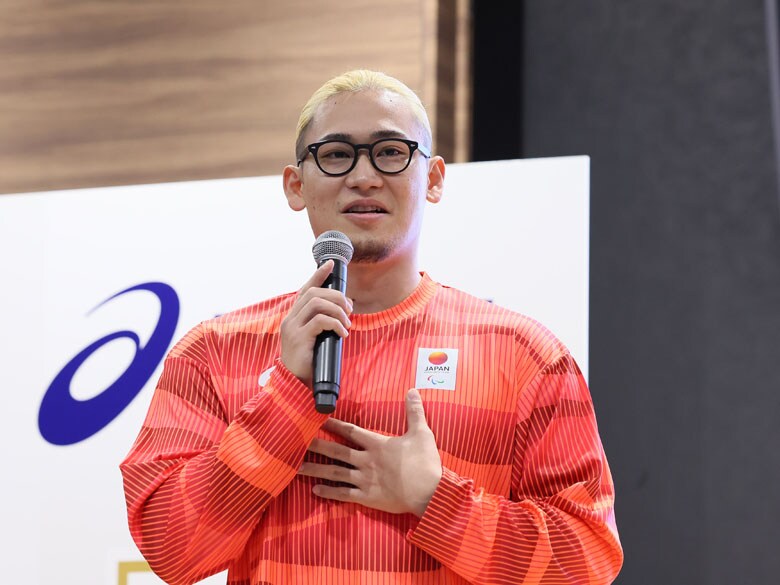 宮食は、「改めてすごく闘志が湧く色だなと思います。皆さんもこの色を着てアドレナリン全開で戦っていただけるんじゃないでしょうか。僕は視覚障がいがありますが、この色は目立つので、(応援Tシャツや公式ウエアを着ている人たちが集まっている)観客席を見て、あそこは日本ゾーンだなとわかりました」と、パリ大会を振り返り、色の効用を語った。