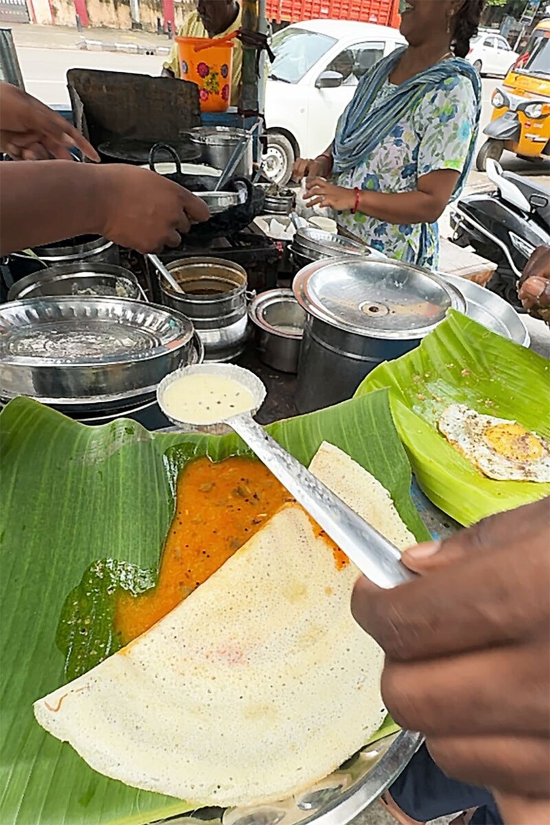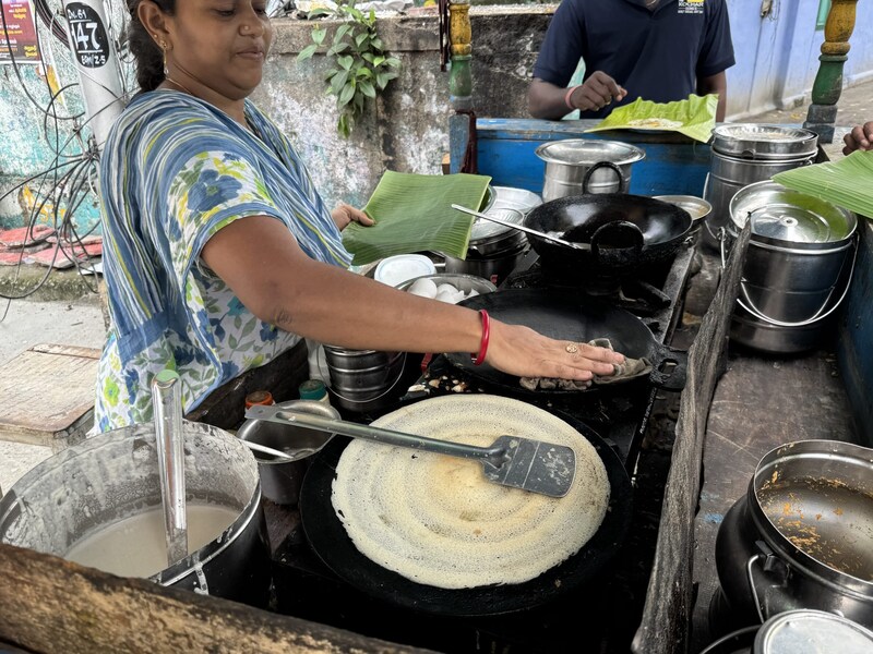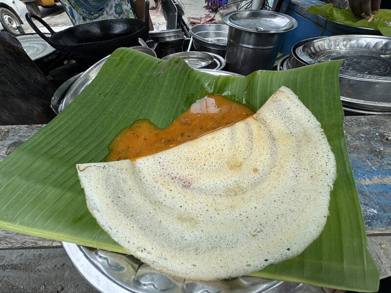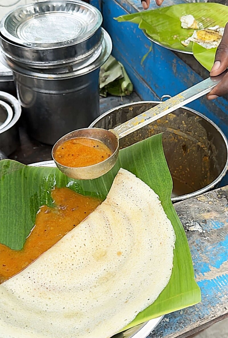 オーダーすると、姉さんがドーサを焼いてくれます。皿にドーサをのせてくれるので、あとはセルフサービスで作り置きのスープ(サンバル)をドーサにかけて食べます。