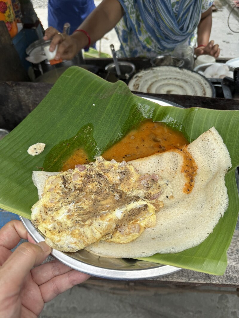 今回はドーサと玉子焼きに、たっぷりとスープとヨーグルト(ダヒ)をかけて食べました。お客さんたちが「お! 外国人が来たな」と思ったようで、めちゃくちゃ親切にしてくれました。スープをどんどん盛ってくれたのです。