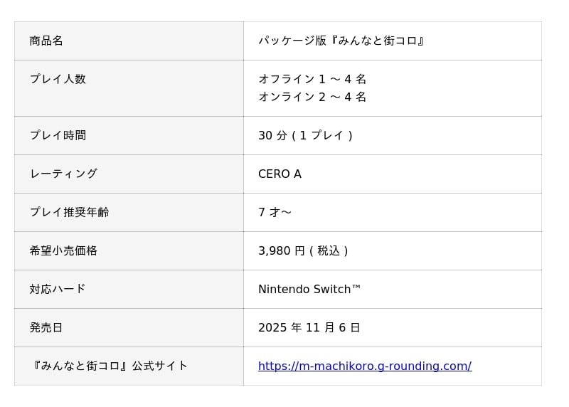 グランディング株式会社(本社:福岡市中央区 代表取締役 CEO : 二木 幸生)は、本日『みんなと街コロ』パッケージ版、『みんなと街コロ 初回限定版』を Nintendo Switch(TM) にて発売したことをお知らせいたします。