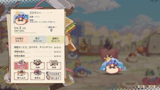食べ物を与えたり、訓練したり、パティ同士を練りこんだりすることで、パティは徐々に成長していきます。