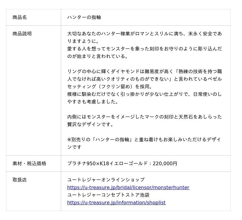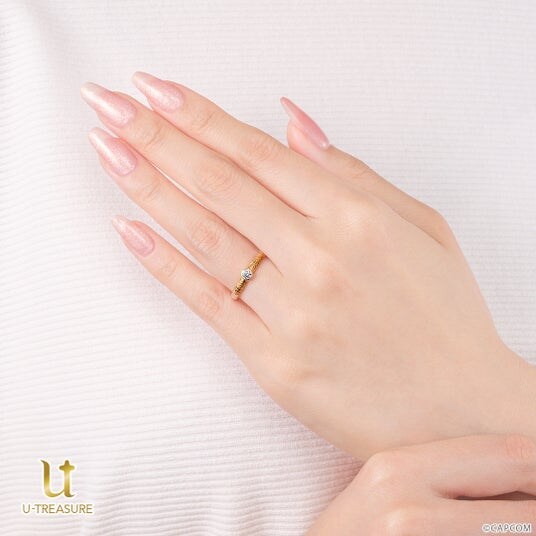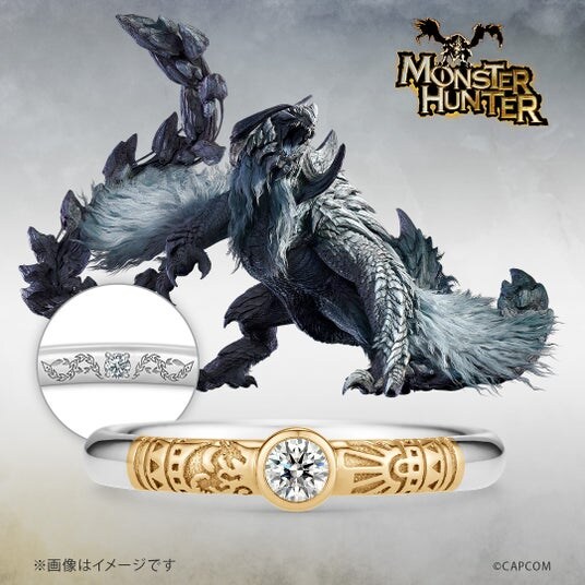 このたびの新作は、内側にモンスターを象った刻印をデザインしたリング(指輪)です。「アルシュベルド」モデルにダイヤモンドを、「ラギアクルス」モデルにはブルートパーズをあしらいました。