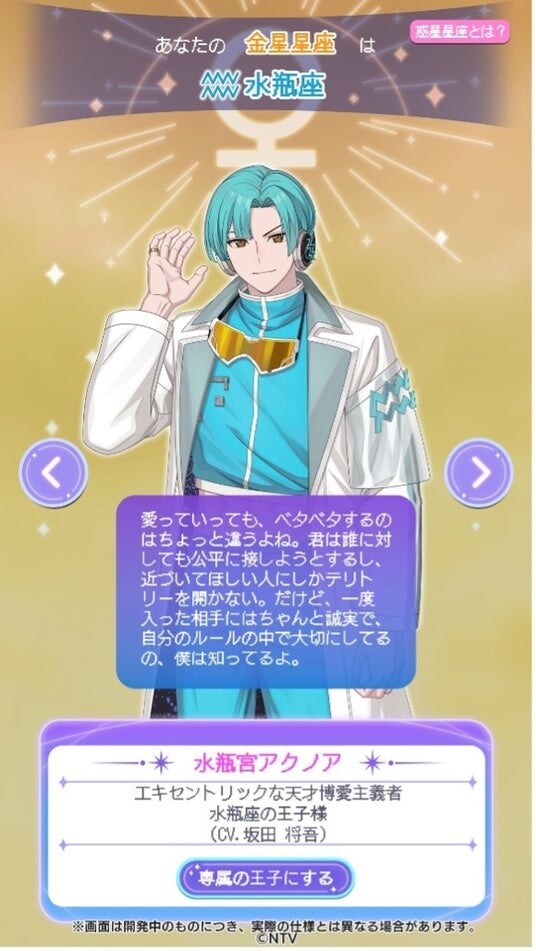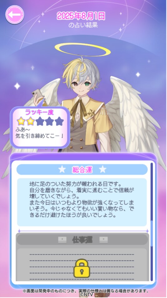本ゲームは、ボイス付き星占い・コミュニケーション・日記・着せ替えなど、日々の暮らしを彩る多彩な機能を通して「癒し」と「ときめき」を届ける、新感覚のライフサポート型フォーチュン・コミュニケーションゲームです。
