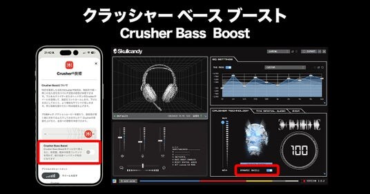 新機能「クラッシャーベースブースト(Crusher Bass Boost)」は、Skullcandy独自のクラッシャーサウンドシステムをさらに進化させる機能です。アプリ上で有効にすることで、低音の迫力と臨場感を一段と高め、まるでライブ会場やシアターにいるかのような重低音体験を楽しめます。「クラッシャーベースブースト」は、システム内で低音域をより力強く感じられるよう最適化するブーストサポート機能。低音が物足りないシーンや、より深く没入したい瞬間に、サウンド全体のエネルギーを引き出し、安定したパワフルな重低音を届けます。