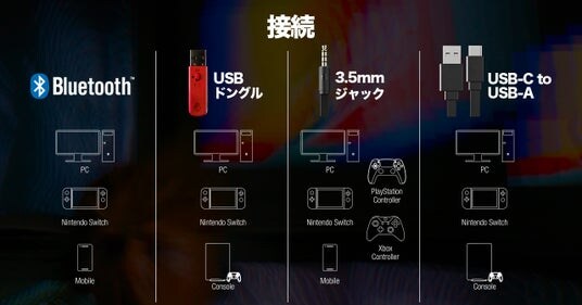 PC、Nintendo Switch(TM)、PlayStation(TM)、Xbox、モバイルデバイスにも接続可能です。これらのデバイスには、ドングル(2.4GHz)、Bluetooth(R)5.3、USB-C、3.5mmAUXケーブルを使って接続でき、ゲームの種類や用途に応じて使用することができます。