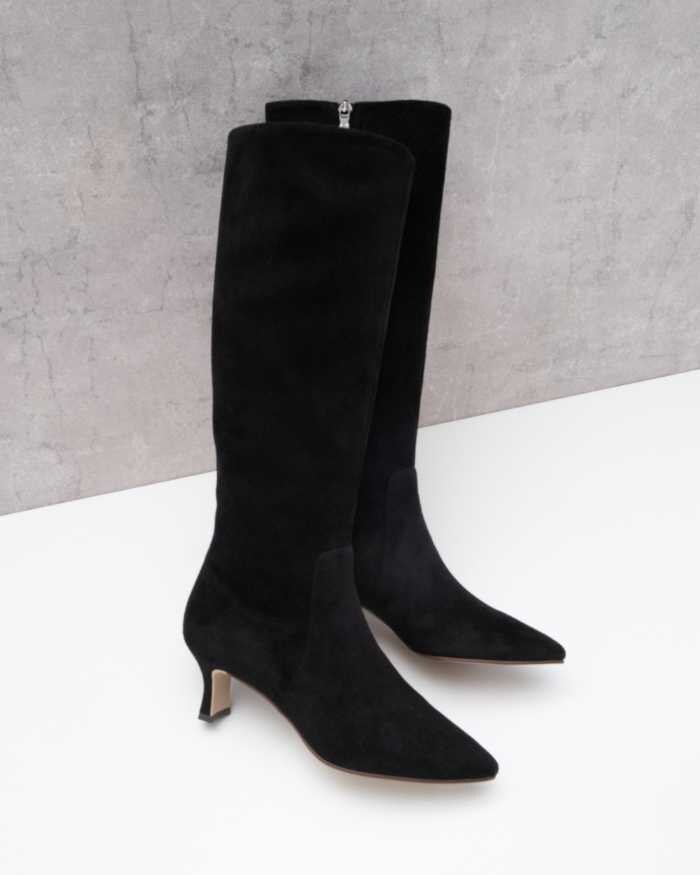 セミルーズシルエットのロングブーツは、脚のラインを拾いすぎず、すらりと見せてくれる絶妙なデザイン。